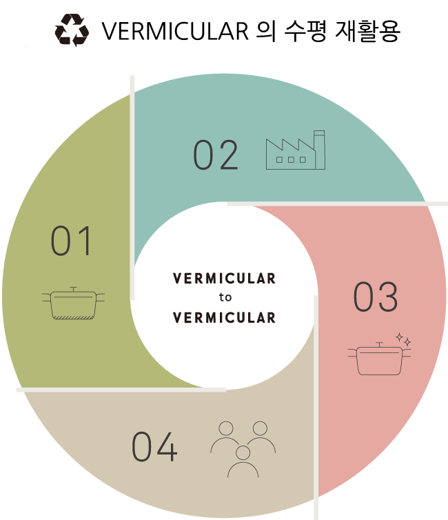VERMICULAR에서 VERMICULAR로의 수평적 재활용은 최소한의 공정으로 100% 원료 재활용이 가능하며, 이는 매우 친환경적인 재활용 프로그램입니다.