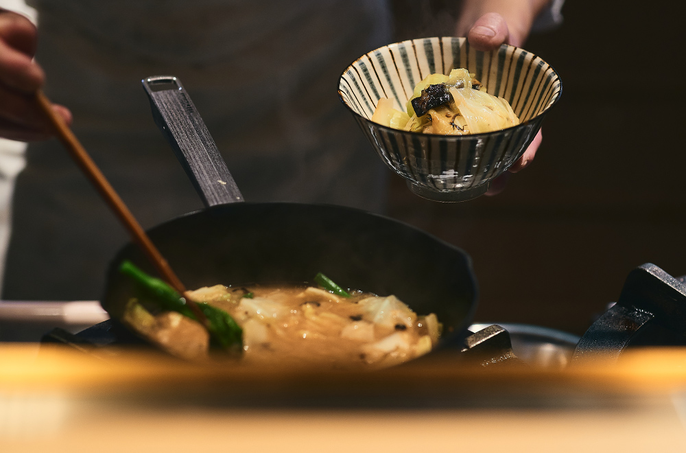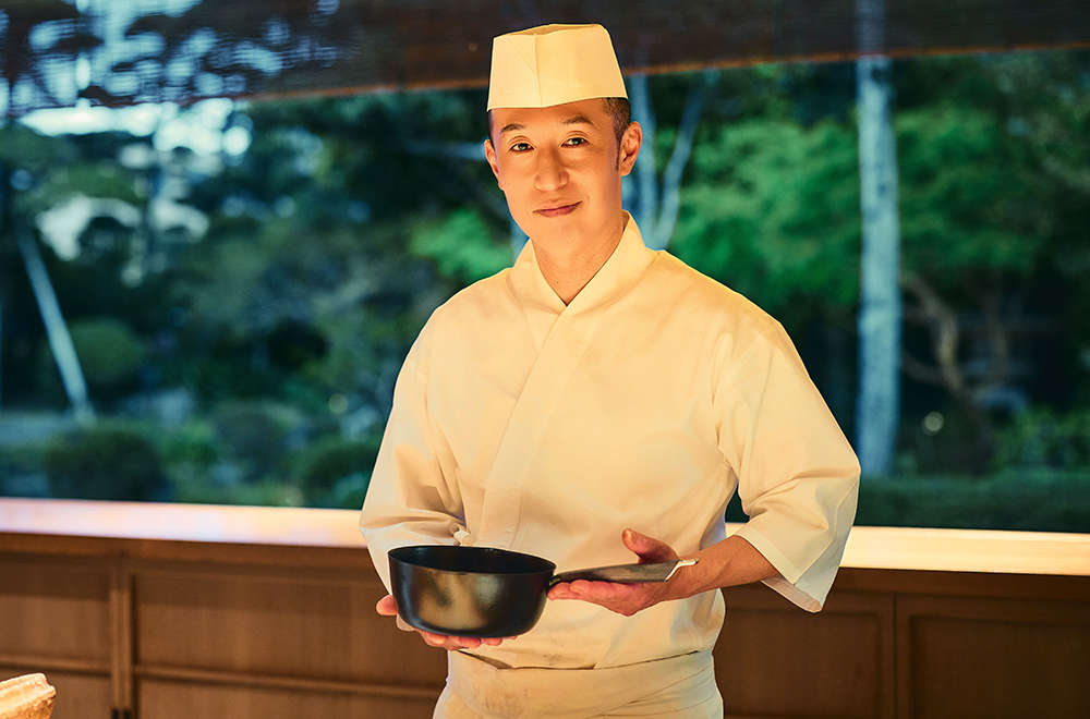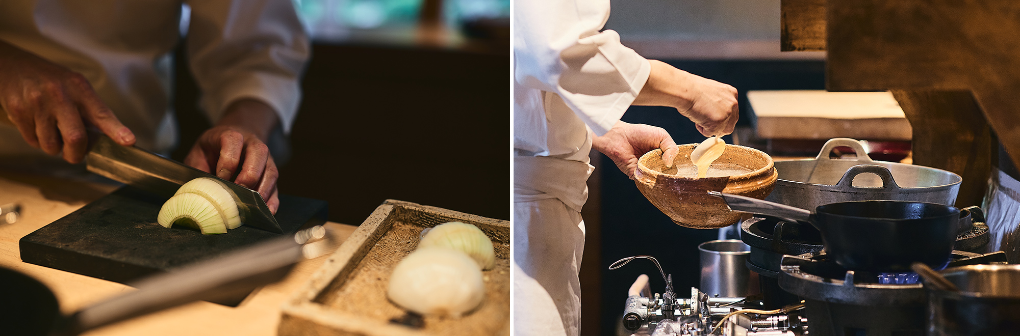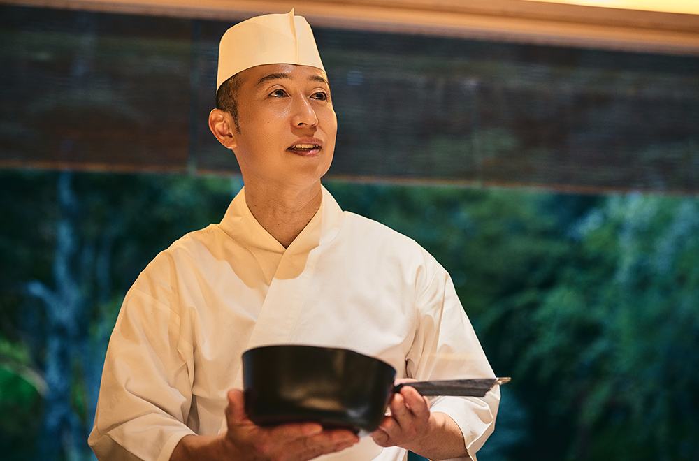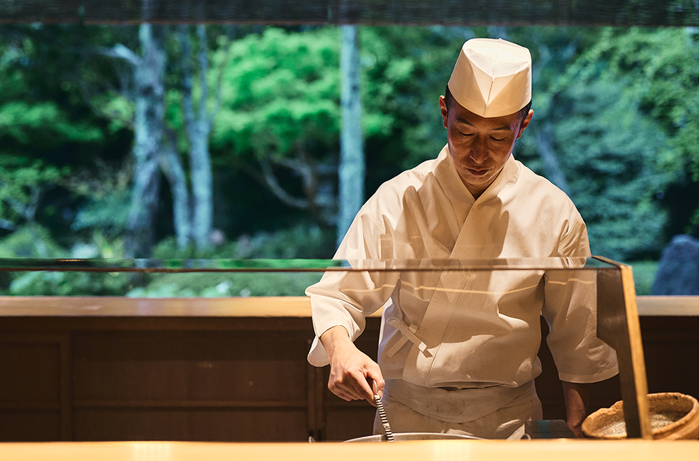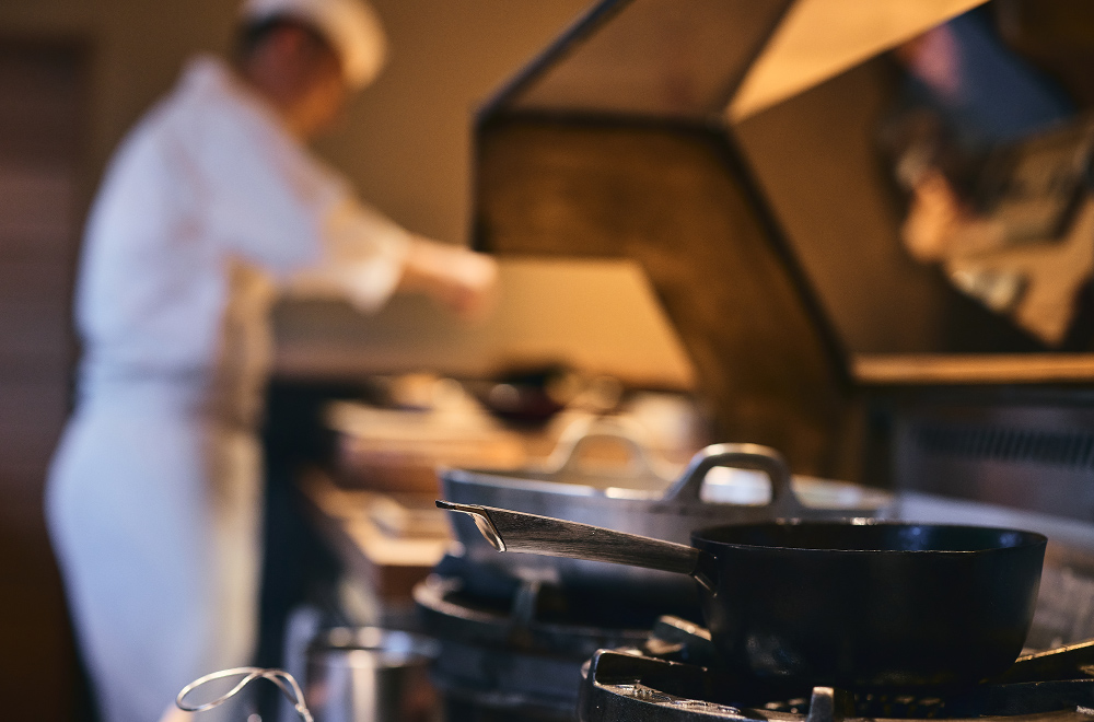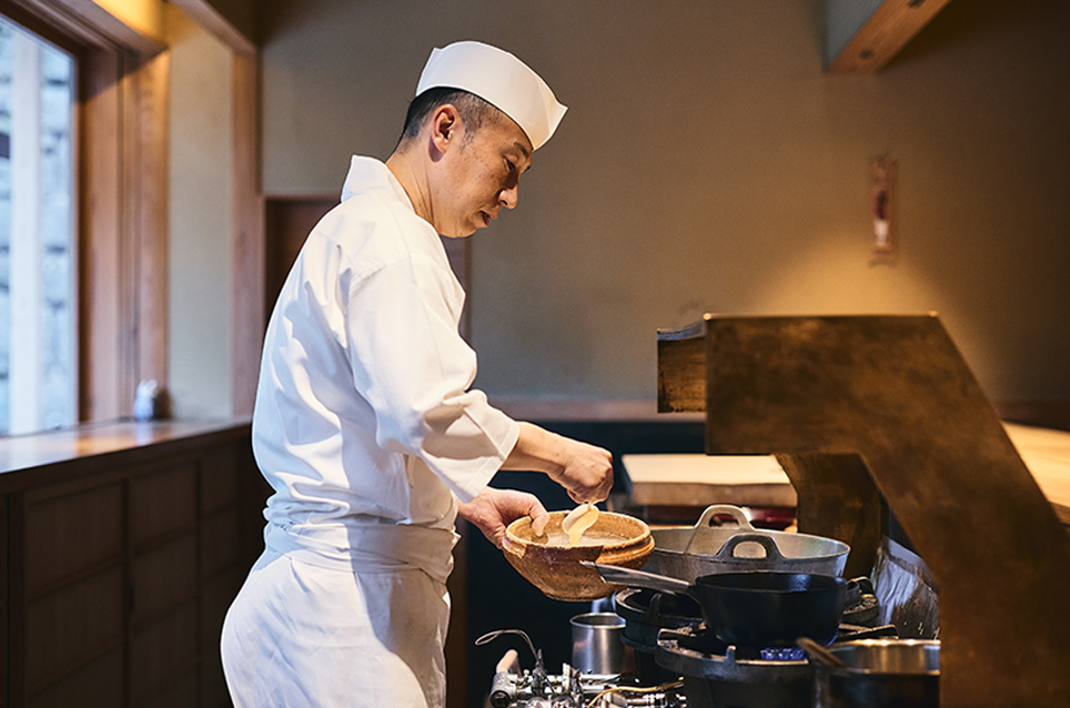 총 550평(약 1,800㎡) 규모의 넓은 부지이지만, 좌석은 오직 카운터 8석이 전부입니다. 등 뒤로 보이는 커다란 통창 너머에는 무로마치 시대부터 이어져온 일본 정원이 펼쳐져 있습니다. 주방에는 시무라 셰프와 단 하나의 냄비뿐. 손님 앞에서 한 접시 한 접시, 정성껏 요리가 완성됩니다. 이곳은 오로지 「요리」에 집중할 수 있도록 설계된 공간입니다.