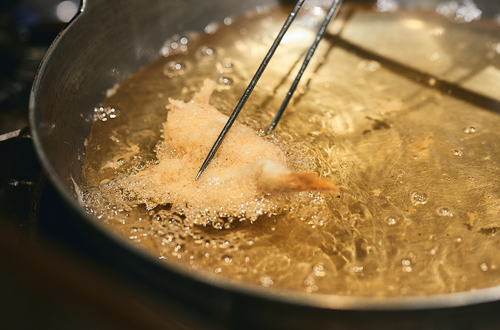 이렇게 높은 온도에 재료를 급격히 노출시키면, 튀김옷이 바삭하게 잘 구워지고 향도 확 살아납니다.」