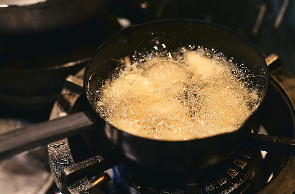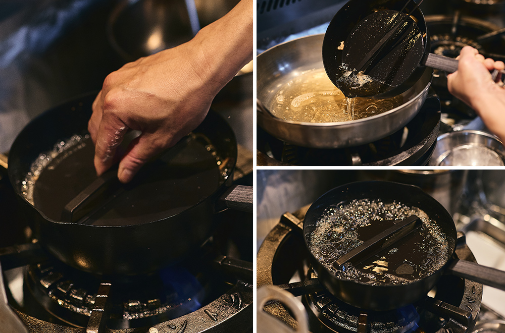 마치 어니언 그라탕 수프처럼, 오랜 시간 천천히 익힌 듯한 깊은 풍미를 내기 위해 마지막 단계로 「튀기듯 굽는」 과정을 진행합니다.