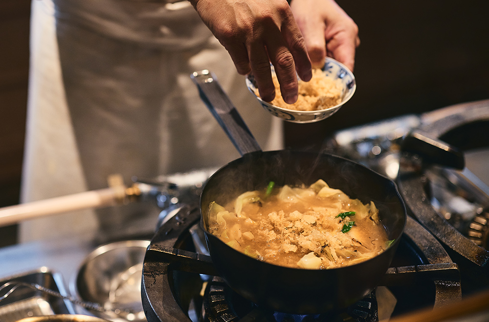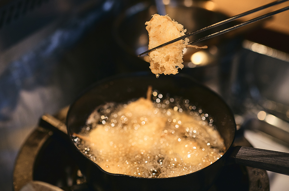 「마무리 토핑에는 텐푸라 조리 중 생긴 '튀김 부스러기'를 올려줍니다. 재료의 맛이 배어 있는 튀김 부스러기를 더하면, 생선 육수의 깊은 감칠맛, 구운 채소의 고소한 풍미에 또 한 겹의 깊이 있는 맛이 더해지죠.