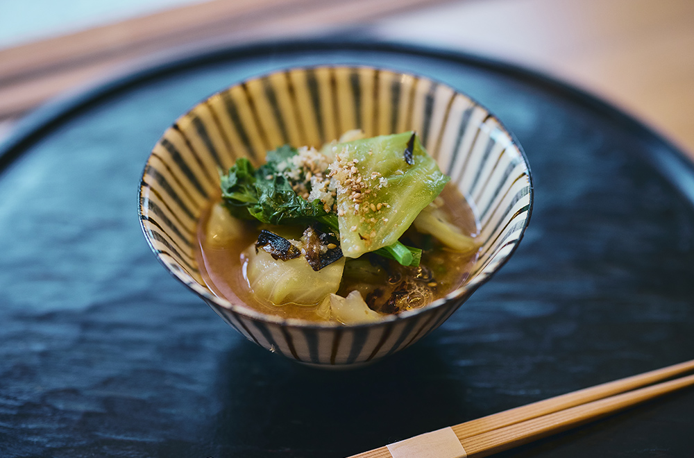 이어 시무라 셰프가 선보이는 요리는 구운 양배추와 유채나물이 들어간 된장국입니다.
